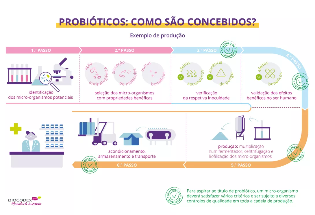 - A última fase serve para garantir que o probiótico está vivo e na dose efetiva durante toda a vida útil do produto. As cepas probióticas são depositadas num "banco internacional de cepas microbianas"4,27.