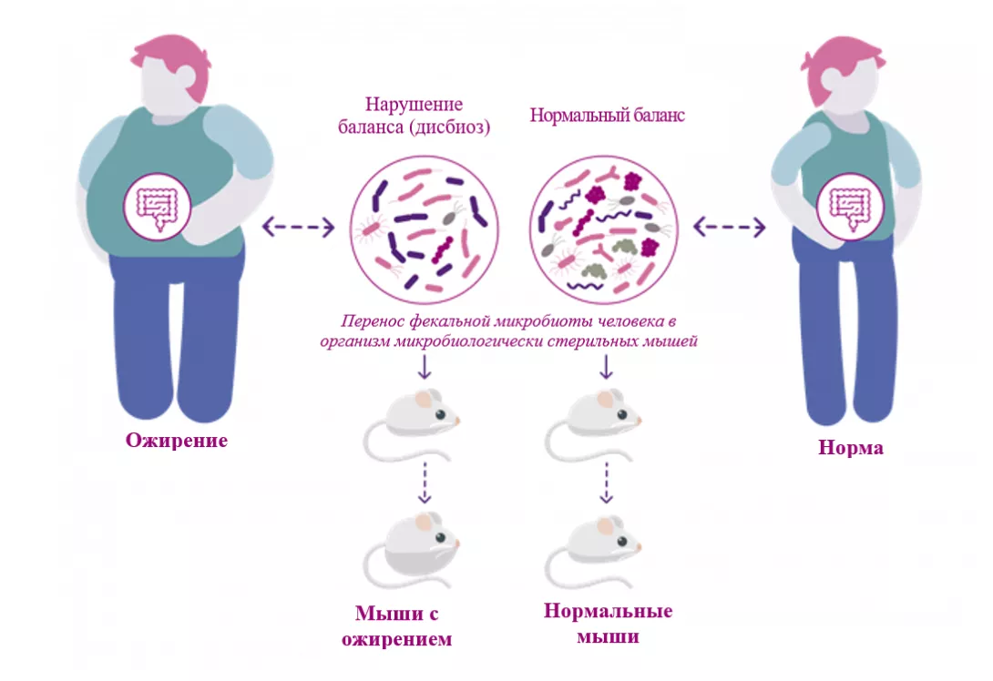 Исследования ожирения с использованием фекальных трансплантатов, переносимых от человека в организм микробиологически стерильных мышей, раскрыли взаимосвязь между кишечным микробиомом и энергетическим метаболизмом: