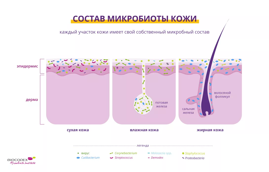 Несмотря на это, кожа имеет собственную уникальную микробиоту, в состав которой входят бактерии (Cutibacterium acnes, Staphylococcus epidermidis и др.), грибы (например, Malassezia), вирусы (например, папилломавирус) и паразиты (включая клещей, таких как Demodex). Эти микроорганизмы живут в идеальной гармонии и вместе образуют микробиоту кожи.1,5