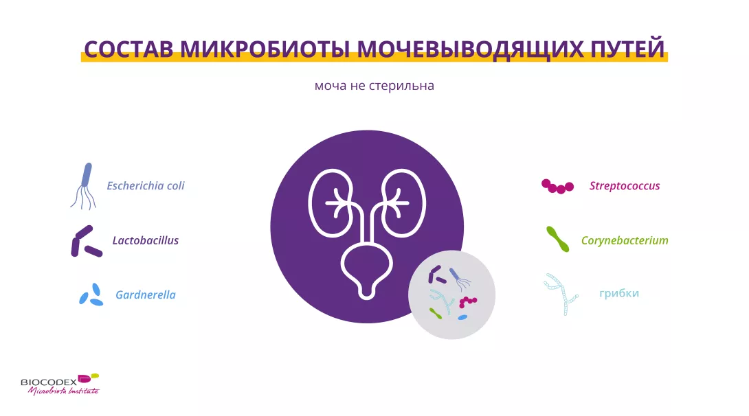 Новые технологии обнаружения микроорганизмов позволили выявить другие виды бактерий в составе микробиоты мочевыводящих путей. Чаще всего обнаруживают представителей рода Lactobacillus и, в меньшей степени, Gardnerella, Streptococcus и Corynebacterium.3 Также выявлены различные сообщества грибков.6