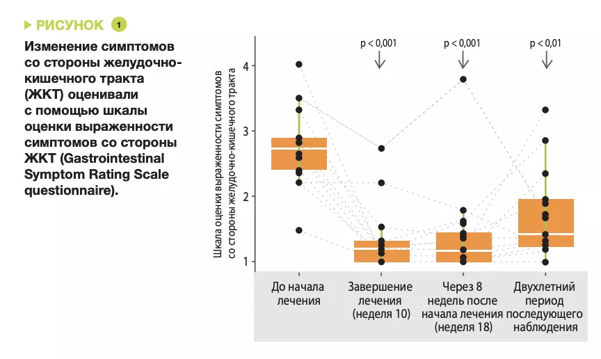 Известно, что дети с расстройствами аутистического спектра страдают от различных проблем со стороны ЖКТ, включая запоры, диарею и вздутие живота. У этих детей также имеются дисбиотические изменения микробиоты кишеч- ника, характеризующиеся повышенным соотноше- нием фирмикутов и бактероидов в связи с низким относительным содержанием бактероидов. Этот дисбиоз изменяет связь «кишечник — головной мозг», усугубляя проблемы со стороны ЖКТ и способствуя усилению характерного аутистического поведения. Терапия методом трансплантации кишечной микробиоты заключается в начальной подготовке ЖКТ с помощью 14-дневного курса ванкомицина и очищении кишечника на 15-й день с последую- щей трансплантацией фекальной микробиоты с использованием высокой начальной дозы стандар- тизированной микробиоты кишечника человека (пероральным или ректальным путем), а затем низкой поддерживающей дозы в течение 7–8 недель, одновременно с ингибитором протонной помпы начиная с 12-го дня. Kang et al. ранее сообщали, что в 8-не- дельном наблюдении использование этого метода лечения в дополнение к модификации кишечной микробиоты приводило к снижению симптоматики со стороны ЖКТ на 80% и менее выраженному снижению поведенческих симптомов у детей с рас- стройствами аутистического спектра (РАС) [2].