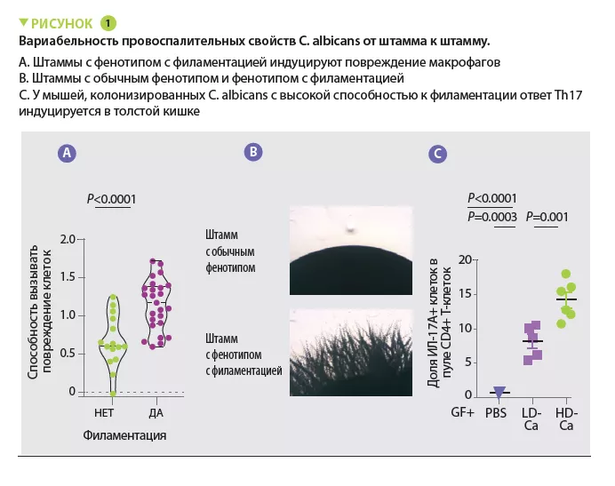 В соответствии с результатами ряда других исследований, авторы сначала заметили, что микобиота пациентов с ЯК содержала больше Candida albicans и меньше — Saccharomyces. При нарушениях иммунного ответа, вызванного терапией кортикостероидами, C. albicans усугубляла тяжесть колита у мышей. Затем авторы выделили несколько штаммов C. albicans из микобиоты здоровых людей и пациентов с ЯК и наблюдали широкую гетерогенность с точки зрения их провоспалительной способности. В частности, способность вызывать повреждение макрофагов, ключевого звена защиты от грибковых инфекций, варьировала от одного штамма к другому. Штаммы, способные вызывать повреждение макрофагов, имели более высокую склонность к филаментации и индукции провоспалительных эффектов по механизму Th17 in vivo (рисунок 1). Авторы показали, что большая часть провоспалительных эффектов была опосредована секрецией токсина — кандидализина — и индукцией синтеза ИЛ-1β. Последующие анализы выявили сильную корреляцию между провоспалительной способностью штаммов, выделенных у пациентов с ЯК, и воспалительной активностью заболевания. С другой стороны, корреляция между выраженностью воспаления и общим содержанием Candida albicans в кишечнике у пациентов отсутствовала. Эти результаты объясняют, почему состав микобиоты плохо коррелирует с характеристиками заболеваний, и позволяют предположить, что функциональные возможности (в данном случае провоспалительные) микобиоты могут лучше объяснить ее патогенетическую роль.