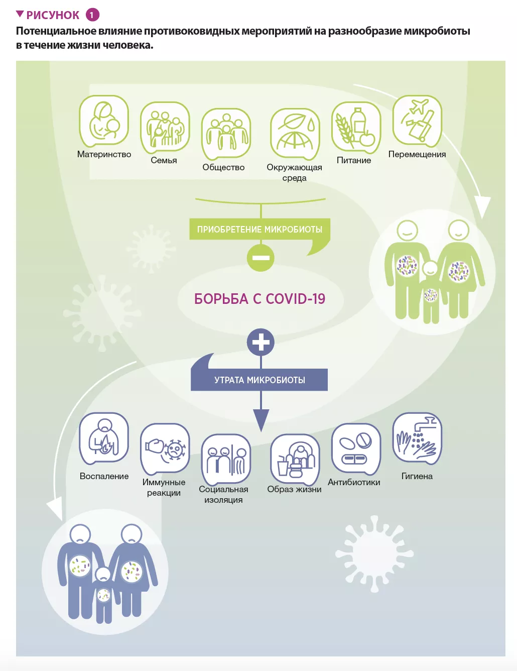 Пандемия COVID-19 серьезно повлияла на здоровье людей. Finlay et al. исследуют, как COVID-19 и меры по борьбе с инфекцией влияют на общее состояние здоровья людей [1]. Наши действия во время пандемии могут значительно повлиять на микробиом инфицированных и неинфицированных людей с возможными последствиями для здоровья в будущем. Все больше данных указывает на уменьшение разнообразия микробиомов человека во всем мире, причем за последние несколько десятилетий этот процесс ускорился наряду с параллельным ростом числа хронических неинфекционных заболеваний. Пандемия COVID-19 может усугубить эти проблемы за счет уменьшения разнообразия нашей микробиоты, обусловленного усилением гигиенических процедур, изменением доступа к продуктам питания, снижением социальных контактов и т. д.На данном этапе долгосрочное влияние пандемии на микробиом и, как следствие, на здоровье человека еще не так очевидно. Текущая ситуация с COVID-19 предоставляет уникальную «живую лабораторию» для изучения в режиме реального времени того, как пандемии могут влиять на здоровье человека в краткосрочной и долгосрочной перспективе, а также того, как эти последствия могут повлиять на людей и сообщества.