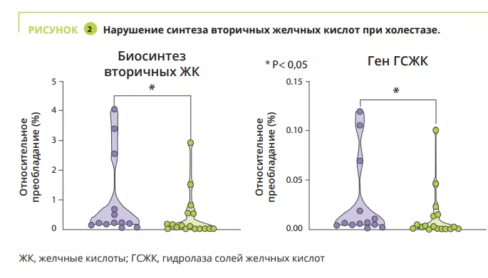 Желчные кислоты необходимы для всасывания липидов и жирорастворимых витаминов. При холестазе наблюдается уменьшение содержания желчных кислот в кишечнике, а также нарушения соотношения различных желчных кислот. Первичные желчные кислоты образуются из холестерина и подвергаются конъюгации в печени. В результате их взаимодействия с кишечной микробиотой под действием микробного фермента, гидролазы солей желчных кислот (ГСЖК), образуются вторичные желчные кислоты.