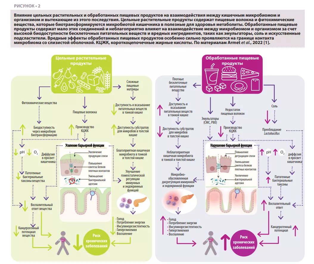 Согласно большинству рекомендаций по питанию [1], в ежедневном рационе должны доминировать цельные растительные продукты (овощи, фрукты, цельные зерна, бобовые и орехи), которые подверглись ограниченной обработке (рисунок 1). Эту рекомендацию хорошо подкрепляют наши знания о микробиоме (рисунок 2 и рисунок 3). Цельные растительные продукты — единственный естественный источник пищевых волокон, часть из которых являются ферментируемыми и обеспечивают рост микробов. Разнообразная растительная пища поддерживает разнообразие микробиома, а ферментация волокон приводит к образованию метаболитов, таких как короткоцепочечные жирные кислоты (КЦЖК), оказывающих широкий спектр метаболических (влияние на чувство насыщения и чувствительность к инсулину), физиологических (увеличение продукции слизи и экспрессия белков плотных контактов) и экологических (ингибирование роста патогенов) эффектов [2]. Кроме того, предоставление субстратов для роста бактерий предотвращает разрушение слизи, воспаление и возникновение инфекций у мышей [3]. Фитохимические вещества, присутствующие в цельных растительных продуктах, большая часть которых не всасывается в тонкой кишке, также подвергаются биотрансформации кишечной микробиотой, что повышает их биодоступность, всасываемость, антиоксидантное и иммуномодулирующее действие [4]. Однако, на данный момент значение этих взаимодействий для здоровья не полностью известно. Наконец, функциональные характеристики и питательные качества (например, состав и доступность) большинства цельных растительных продуктов значительно превосходят обработанные пищевые продукты, которые часто содержат пищевые добавки, ухудшающие состав микробиома и барьерную функцию кишечника (рисунок 2).