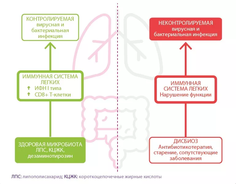 Любые факторы, вызывающие дисбиоз микробиоты кишечника, также могут изменить обычно полезную перекрестную коммуникацию между кишечником и легкими, повышая восприимчивость к респираторным инфекциям10.