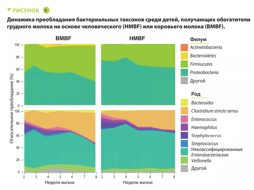 - Использование обогатителей грудного молока на основе человеческого или коровьего молока у младенцев с очень низкой массой тела при рождении по-разному изменяет бактериальный состав микробиоты кишечника в течение первых недель жизни.