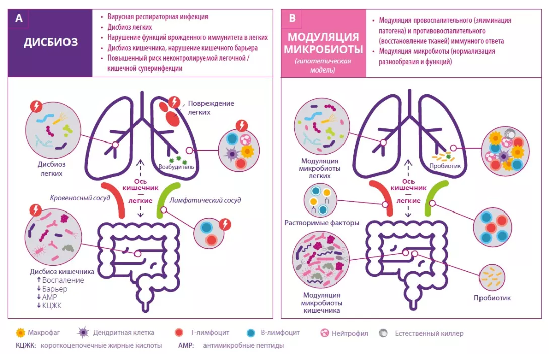 РИСУНОК 7. Ось кишечник — легкие во время вирусной респираторной инфекции (A) и модель модуляции микробиоты с помощью пробиотиков (B).
