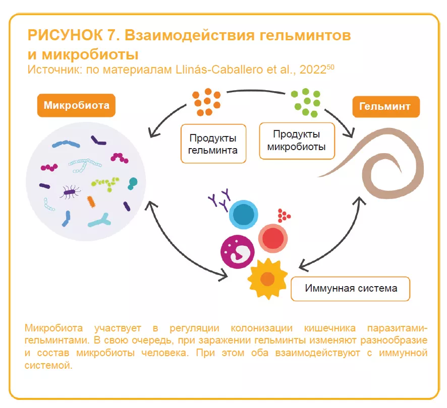 В настоящее время изучаются сложные взаимодействия между гельминтами и микробиотой («двумя старыми друзьями человека»)50 (рисунок 7). Авторы указывают на существование сложного и динамичного взаимодействия между паразитом(ами), микробиотой и иммунитетом хозяина, способного влиять на клинические исходы паразитарных инфекций. 46,48