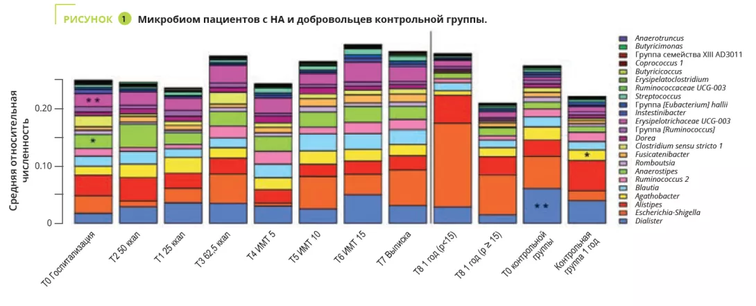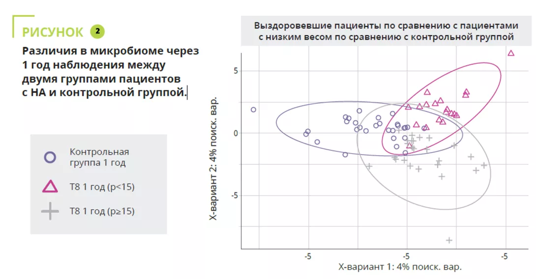 Это первое продольное исследование по оценке изменений КМ у пациентов с НА в течение такого длительного периода времени (один год). В исследовании участвовало 56 пациентов в возрасте от 12 до 20 лет и 34 участника контрольной группы. Анализ кишечной микробиоты проводили при поступлении и перед выпиской (T0-T7), а затем спустя год от момента поступления (T8). Восемь пациентов прервали участие и повторно вернулись в исследование; пациентов разделили на группу восстановивших массу тела (ИМТ≥15 p [процентиль]) и группу с сохраняющейся низкой массой тела (ИМТ<15 p).