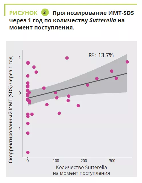 Между моментом госпитализации и через 1 год у пациентов с ИМТ<15 p значимо уменьшилось представительство родов Anaerostipes, Clostridium sensu stricto 1 и Romboustia (р = 0,02), а КМ пациентов с ИМТ≥15 p оставалась более схожей в течение этого периода. Та же тенденция сохранялась для периода между выпиской и через 1 год: четырехкратное увеличение численности рода Escherichia-Shigella (р = 0,04) и двукратное — Alistipes (р = 0,03) у пациентов с ИМТ<15 р. А анализЫ при поступлении выявил значимую связь между продолжительностью заболевания (уровень семейство-тип, р = 0,011-0,022) и потерей массы тела (уровень род-класс, р = 0,030-0,047). Продольный анализ PERMANOVA с поправкой на применение слабительных препаратов показал значимую связь между КМ и количеством потребляемых калорий (р = 0,003, R2 = 0,009), ИМТ-SDS (р = 0,006, R2 = 0,008) и концентрацией лептина на момент поступления, выписки и через 1 год (р = 0,02, R2 = 0,02). Роды Ruminiclostridium 5 (р = 0,006) и Intestinibacter (р= 0,03) ассоциировались с риском повторной госпитализации. Анализ линейной модели с поправкой на применение слабительных, продолжительность заболевания, потерю веса и ИМТ-SMS на момент поступления выявил, что на момент поступления четыре рода ассоциировались с ИМТ-SDS через 1 год: Sutterella, Parasutturella, Lachnospiraceae FCS020 и Clostridium stricto sensu (р = 0,008- 0,04) (рисунок 3).