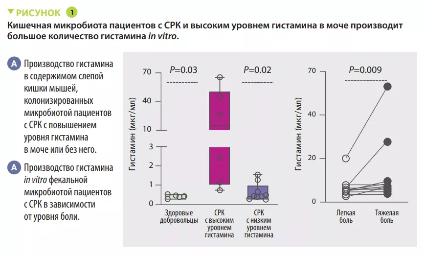 Висцеральная гиперчувствительность и механическая чувствительность кишечника, оцениваемые по изменению потенциала действия в афферентных нервах толстой кишки, были выше у микробиологически стерильных мышей, колонизированных ЗАКЛЮЧЕНИЕ Микробиота кишечника вовлечена в патофизиологию висцеральной боли у пациентов с СРК. У некоторых пациентов она связана с производством гистамина на фоне диеты, богатой ферментируемыми углеводами. Нацеленное воздействие на гистаминпродуцирующие бактерии или блокада рецептора H4 может стать действенной терапевтической стратегией для таких пациентов. фекальной микробиотой пациентов с СРК с более высоким уровнем гистамина в моче по сравнению с мышами, колонизированными микробиотой от пациентов с СРК с низким уровнем гистамина в моче. Было показано, что микробиота отвечает за выработку гистамина у пациентов с СРК с высоким уровнем этого метаболита в моче (рисунок 1). Кроме того, диета с низким содержанием ферментируемых углеводов снижала гистамин-опосредованную висцеральную гиперчувствительность.