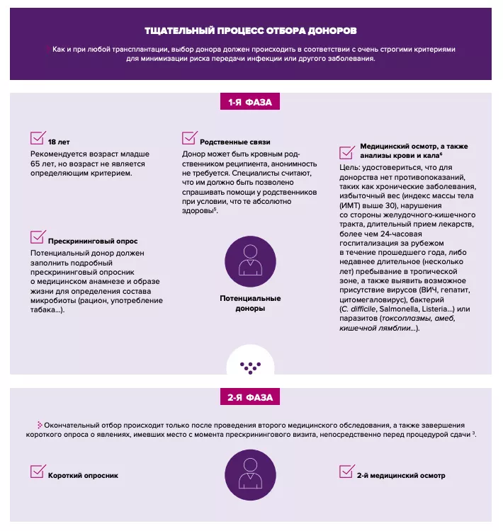Мы с легкостью можем себе представить процесс пересадки кожи, почек или легких. Но как насчет трансплантации фекальной микробиоты (ТФМ)? Столкнувшись с бурным ростом числа новых исследований по ТФМ, органы здравоохранения нескольких стран (включая Францию) опубликовали рекомендации, призванные регулировать данную практику, в особенности отбор доноров, поскольку для трансплантации требуется донор и не все отвечают требованиям для донорства фекальной микробиоты!