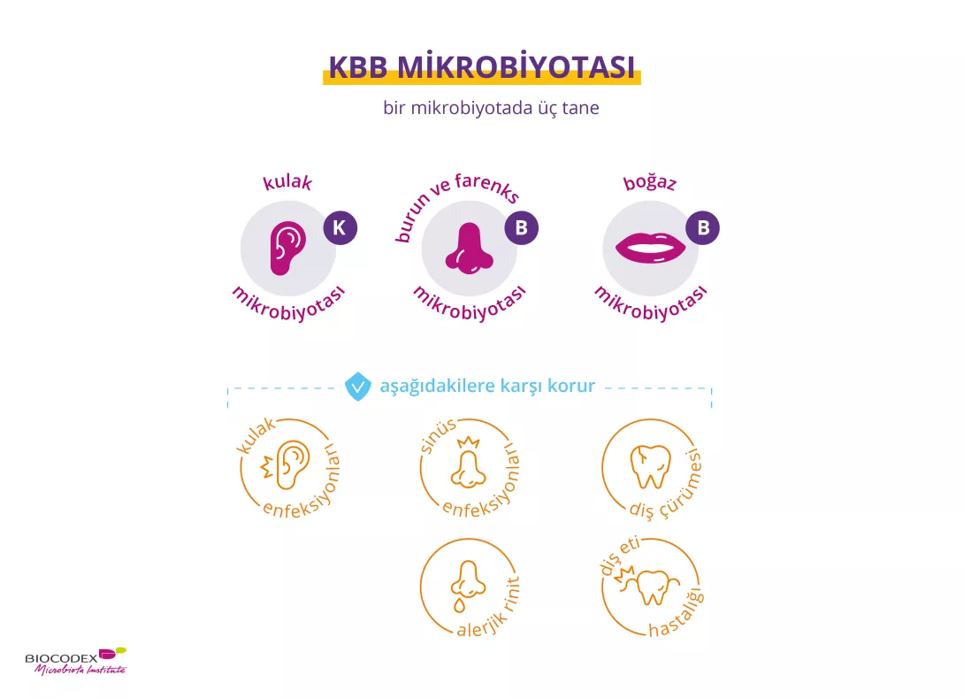 KBB (kulak, burun, boğaz) mikrobiyotası üç farklı bakteri florasından oluşur: ağız mikrobiyotası, kulak (oriküler) mikrobiyotası ve nazofaringeal mikrobiyota.