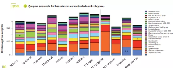 Bu çalışma, AN hastalarında bağırsak mikrobiyomu (GM) değişiklikleri üzerine bu kadar uzun bir zaman diliminde (bir yıl) yürütülen ilk boylamsal çalışmadır. Çalışmaya yaşları 12-20 arasında değişen 56 hasta ve 34 kontrol grubu dahil edilmiştir. Dışkılar hastaneye yatışta ve taburcu olurken (T0-T7), ardından da hastaneye yatıştan bir yıl sonra (T8) toplanmıştır. Sekiz hasta çalışma sırasında yeniden kabul edilmiştir; hastalar kilolarını geri almış olanlar (BMI≥15th p [persentil]) ve hala düşük kilolu olanlar (BMI<15th p) olarak ayrılmıştır.