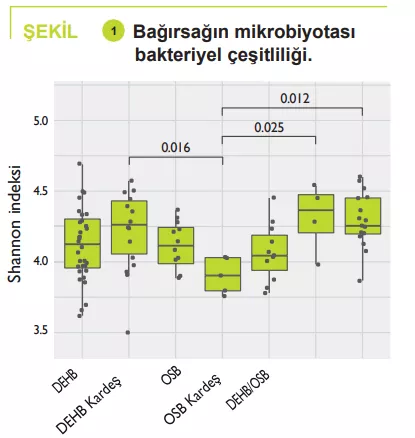 DEHB ve OSB'li çocuklar ve ergen-ler benzer bir bağırsak mikrobiyo-tasına sahiptir, ancak bu mikrobi-yota akraba olmayan kontrollerden farklıdır. Dahası, bağırsak mikrobi-yotasının beta çeşitliliğindeki var-yasyonlar, LBP'deki artışta olduğu gibi, sistemik pro ve anti-enflama-tuar moleküller arasındaki farklılık-larla ilişkilendirilmiştir.