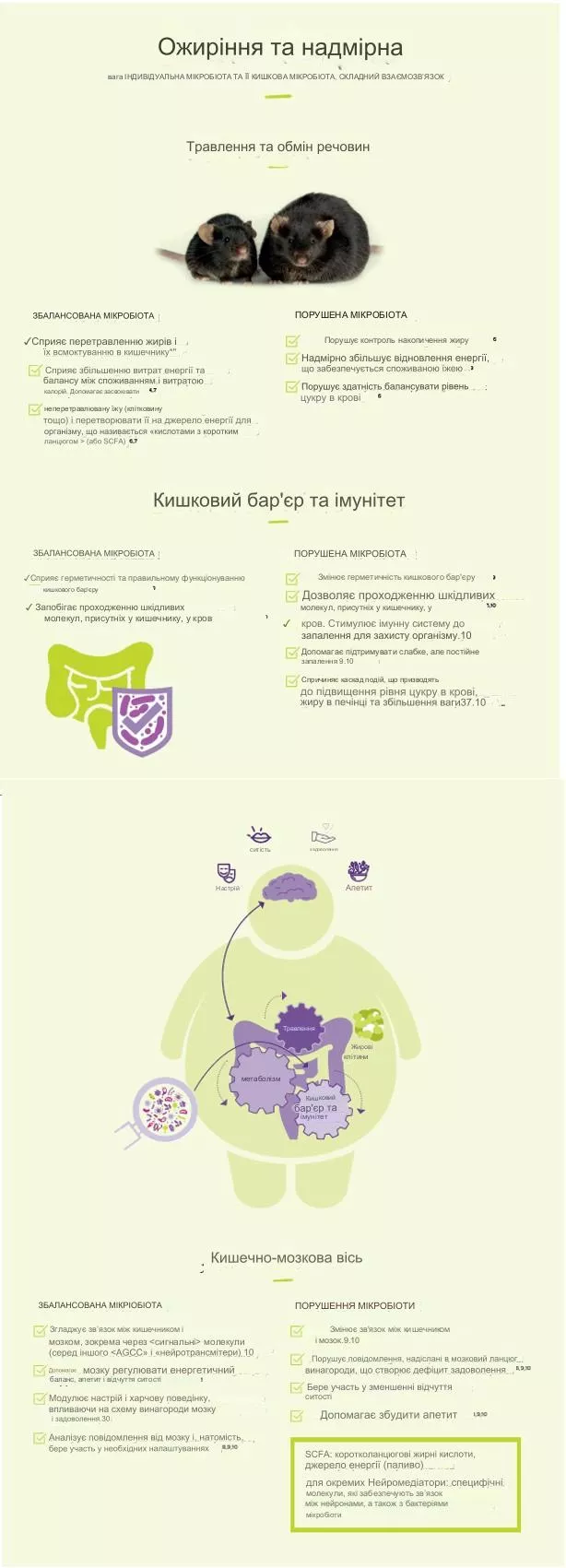 .3 Добре збалансована мікробіота кишківника сприяє хорошому здоров’ю та низці процесів також. Вона сприяє травленню та правильній роботі клітин кишківника, взаємодіє з імунною системою, запобігає проникненню молекул і бактерій через епітелій кишківника, а також спілкується з мозком. У людей з ожирінням і надмірною вагою кишкова мікробіота здається незбалансованою (