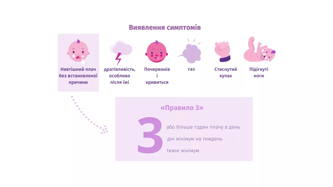 Дитина багато плаче, капризує, лаштує гримаси, стискає кулаки - ймовірно, це кишкові гази.5 Педіатри вже давно використовують "правило трьох" для діагностики дитячих кольок.6 Саме ці критерії були введені у 1954 році та були адаптовані міжнародною організацією як: повторювані і тривалі періоди занепокоєння; плач або дратівливість без очевидної причини, такої як затримка росту, лихоманка або погане самопочуття, яка не може бути усунуте особами, які здійснюють догляд за малюком.7
