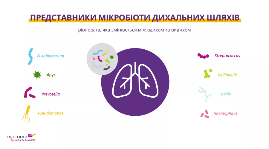 - Високий рівень біорізноманіття. У легенях здорових осіб переважають бактерії з родів Prevotella, Veillonella, Streptococcus, Neisseria, Fusobacterium and Haemophilus.5 Підтримання балансу цих бактерій залежить від ритму вдиху та видиху.6