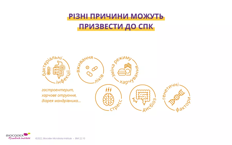 Причини синдрому подразненого кишечника складні і ще не повністю визначені. Вважається, що СПК викликається комбінацією різних факторів, важливість яких різна для кожної людини 2: генетична схильність, певні історії хвороби та лікування, стрес, дієта тощо.